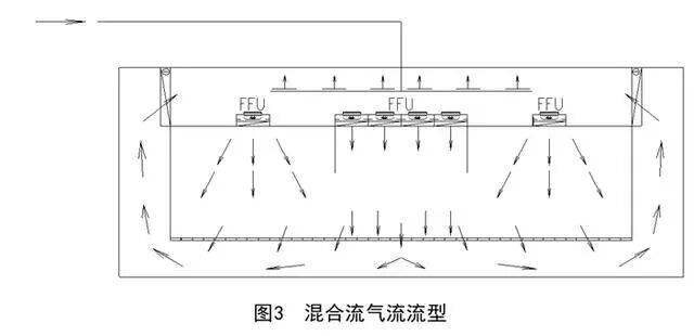 混合流氣流是將垂直單向流和非單向流兩種氣流組合在一起構(gòu)成的氣流流型。這種氣流的特點(diǎn)是將垂直單向流面積壓縮到最小,用大面積非單向流替代大面積單向流以利節(jié)省初投資和運(yùn)行費(fèi)。