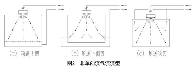 非單向流潔凈室的氣流流型又可分為頂送下回;頂送下側(cè)回;頂送頂回等。