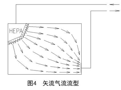 選上側(cè)圓弧型高效過濾器風(fēng)口送風(fēng),對側(cè)下回風(fēng)口回風(fēng)的氣流流型。