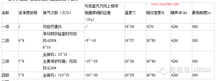 1)、 表中“/”表示不做要求,本表中的噪聲不包括生物安全柜、動(dòng)物隔離器的噪聲,如包括上述設(shè)備的噪聲,則最大不應(yīng)超過68dB(A)
